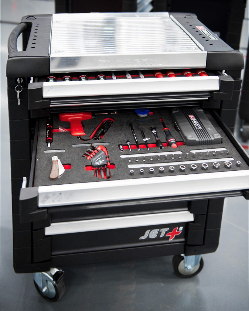 Oferujemy kompleksowe wyposażenie w meble i wózki warsztatowe, zawierające wkładki tool-control w wybranym kolorze, oraz znakowane laserowo narzędzia wraz z tabliczkami informacyjnymi.